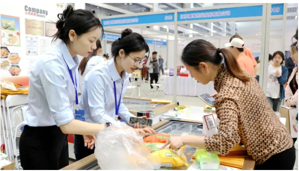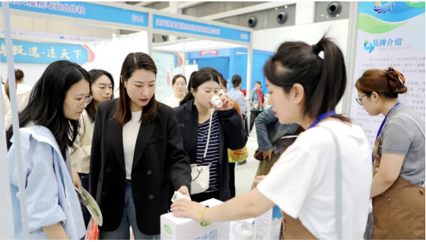 “简苏”牛奶展位同样人气爆棚。乳白色的展台清新自然,与“健康轻食”理念相得益彰。四款不同种类的牛奶包装堆砌成“牛奶墙”,吸引众多消费者驻足品尝。一位宝妈欣喜地说:“我在京东上买过这个牌子的纯牛奶,奶香特别醇厚,入口香浓还有回甘,今天再买些酸奶尝尝。”一旁的网红主播正在直播:“今天我们回馈顾客打折促销,家人们抓紧领取优惠券、扫码下单,顺丰快递包邮到家!”现场顾客也纷纷扫码关注网上店铺,开启“线下体验+线上下单”模式。