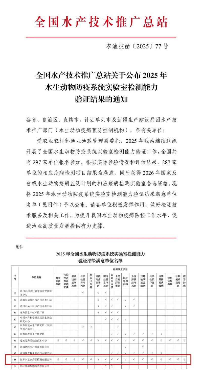 近日,从全国水产技术推广总站传来捷报:在2025年全国水生动物防疫系统实验室检测能力验证中,江苏农垦农产品检测有限公司表现亮眼——其参与的草鱼出血病、对虾玻璃苗弧菌病、急性肝胰腺坏死病等17项疫病病原检测项目全部获评“满意”,并成功入选2026年国家及省级水生动物疫病监测计划相应疫病检测备选实验室名单。