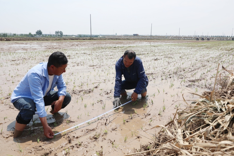 六月的东辛,连片的稻田泛起新绿。在苏垦农发东辛分公司西陬生产区,副主任骆永华与大队长刘辉一道卷起裤腿,深一脚浅一脚地踩进泥泞的水田里,弯腰拨开秧苗,仔细检查株距和栽插深度。他们的身后,一串串足印蜿蜒至田埂边,在稻田里交织成网,与整齐的秧行形成鲜明对比,这些沾满泥土的足迹,正丈量着现代农业提质增效的新路径。