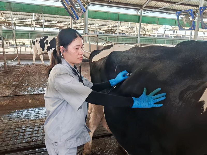 巡棚是张中媛每日雷打不动的必修课。她的目光专注而敏锐,从牛只的鼻子、眼睛到乳房、四肢再到粪便检查,最后用听诊器聆听心脏——这套“排除法”诊断流程,她一丝不苟,绝不遗漏任何一个细微的异常信号。作为一名兽医,这份工作既繁重琐碎又要求极致精细,但张中媛凭借近乎苛刻的严谨态度和扎实过硬的专业技能守护着每一头奶牛的健康。