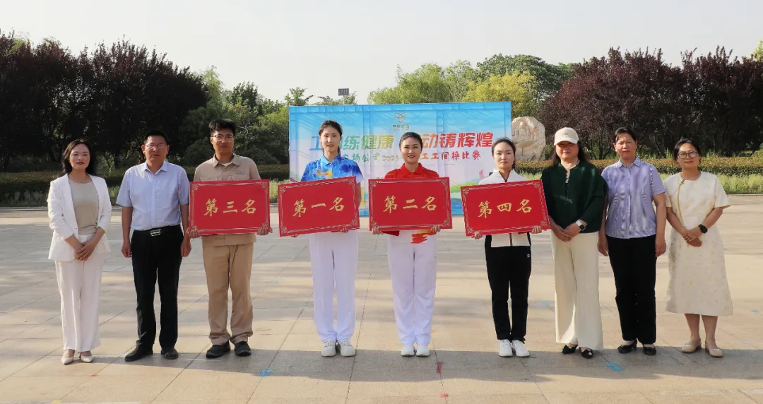 比赛现场气氛热烈,各参赛队伍身着统一服装,精神抖擞。伴随着第九套广播体操的激昂旋律,队员们动作标准有力,将传统工间操的规范性与创新编排的艺术性完美结合,部分队伍在表演中还巧妙融入“同心圆”等创意队形,充分展现了力与美的融合,赢得阵阵喝彩。经过激烈角逐,社区物业代表队凭借出色表现拔得头筹,机关、凯惠电力公司和东米公司代表队分获二、三、四名。