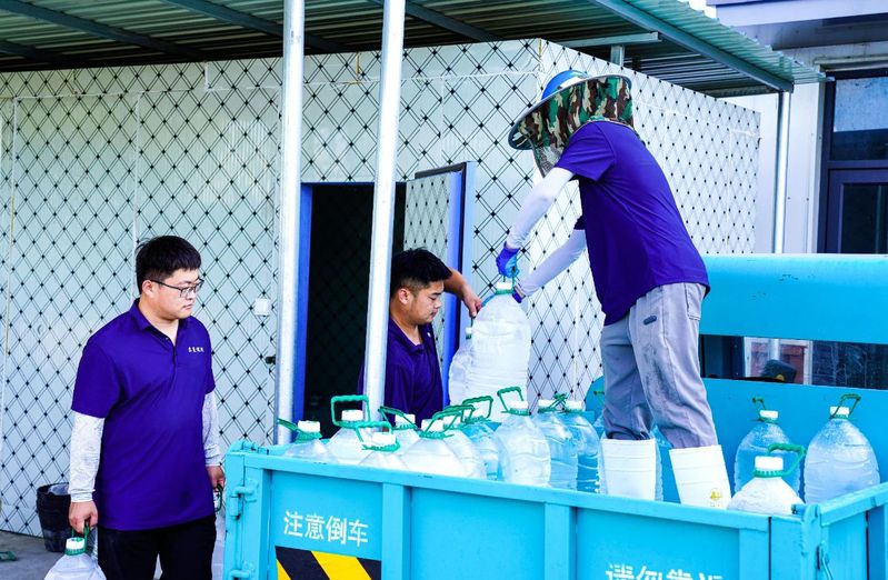 高温时段,为了保障奶牛的生产性能,牧场需要在牛舍水槽中持续投放大量冰块以维持适宜的饮水温度。然而,采购冰块的费用也是一笔不小的开销,公司负责人孙红军看在眼里、急在心上。一次偶然的机会,他看到职工手拿冰水降温,顿时豁然开朗,他随即组织采购了一批12.8升的桶装水,待饮用水使用完毕后,对空桶进行清洗、消毒等标准化处理,再装满水冷冻,将其改成耐用的储冰桶。
