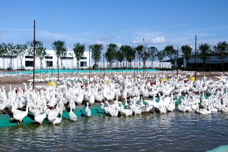 在养殖场内,鹅群或自在踱步,或悠闲觅食,或在水域畅游嬉戏,一片勃勃生机。韩亮介绍,养殖场采用生态散养模式,利用场地资源保障鹅群充分活动,提升肉鹅品质,并配套4栋棚舍用于科学分区管理,确保不同时间段鹅苗的精准饲养。