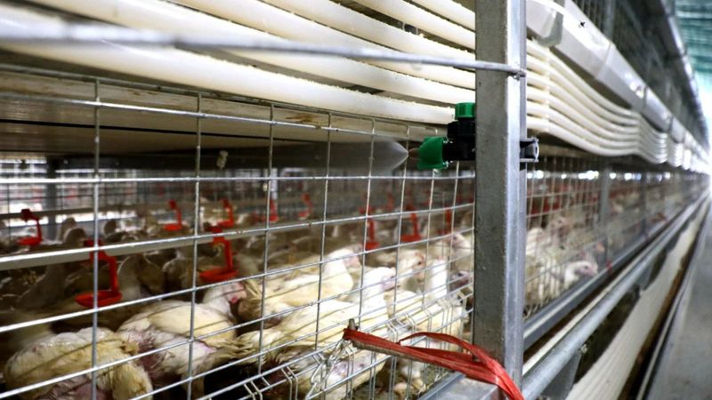 走进东方鸡场鸡舍,一股凉意扑面而来。4层8列的笼舍整齐排布,自动喷淋系统沿着轨道均匀喷洒水雾,为肉鸡降温保湿。笼中的肉鸡神态悠闲,或踱步,或啄食,全然没有传统养殖场夏日里的闷热与嘈杂。“当肉鸡养殖至30日龄且舍内温度升至31℃时,就需要采取降温措施,以减少热应激影响。”技术员张顺超介绍,通过喷淋装置、风机与湿帘的协同配合,即使舍外气温高达40℃,舍内也能精准控温。