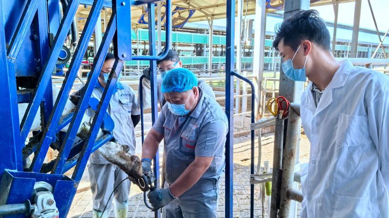 在奶牛养殖中,蹄病严重影响牛群健康。培训中,相关领域资深专家围绕修蹄全流程展开教学,从修蹄的前期准备,到奶牛蹄部病灶识别、角质层精准修剪、蹄形平衡调整及术后护理,手把手指导参训人员。学员们围聚在实训牛只旁,边观摩边记录技术要点,并在反复实操中深化对“精准修剪蹄甲、动态评估肢蹄健康”的理解,力求从源头降低蹄病发生率。一位参训学员表示:“这次培训解决了很多日常修蹄的技术难题,让我系统掌握了牛蹄保健的核心技法。”