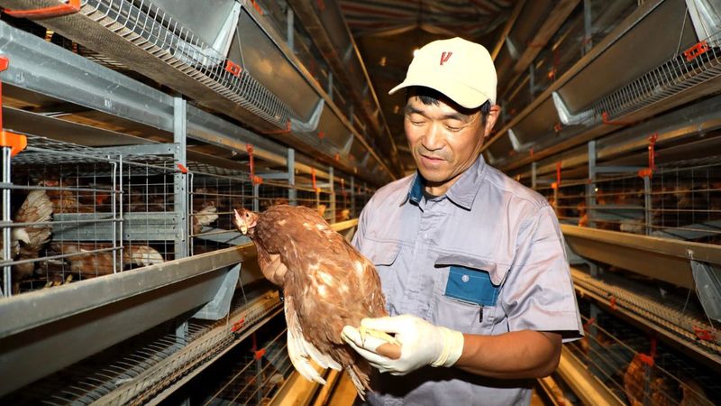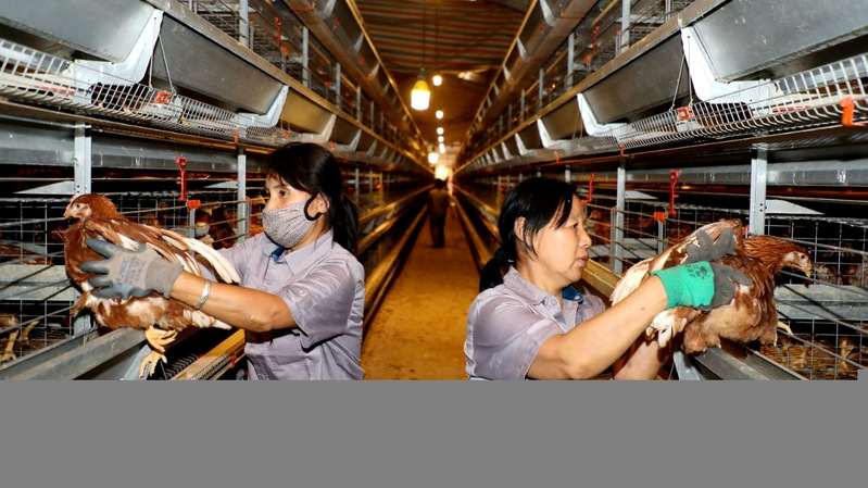 走进4层5列的智能化鸡舍,工人们正有条不紊地为蛋鸡进行体检,并严格按照每笼6羽的标准分装入笼。在温湿度精准调控、光照智能调节的舒适环境中,“新住户”们很快适应,有的悠闲踱步,有的专注啄食,一片生机勃勃。