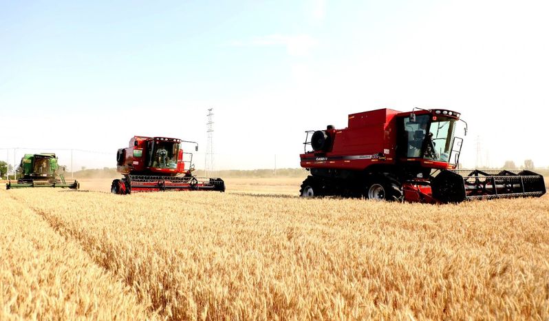 走进海北生产区11大队麦田,饱满的麦穗压弯枝头,三台大型联合收割机穿梭其中,精准完成脱粒和秸秆粉碎等工序。生产区副主任侯志峰介绍:“今年海北生产区种植小麦1.23万亩,已全部进入收获期,我们严格按照‘成熟一片、抢收一片’原则,调配12台收割机不间断轮班作业,天气晴好的情况下,预计一周左右完成全部收割任务。”