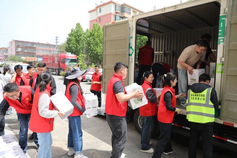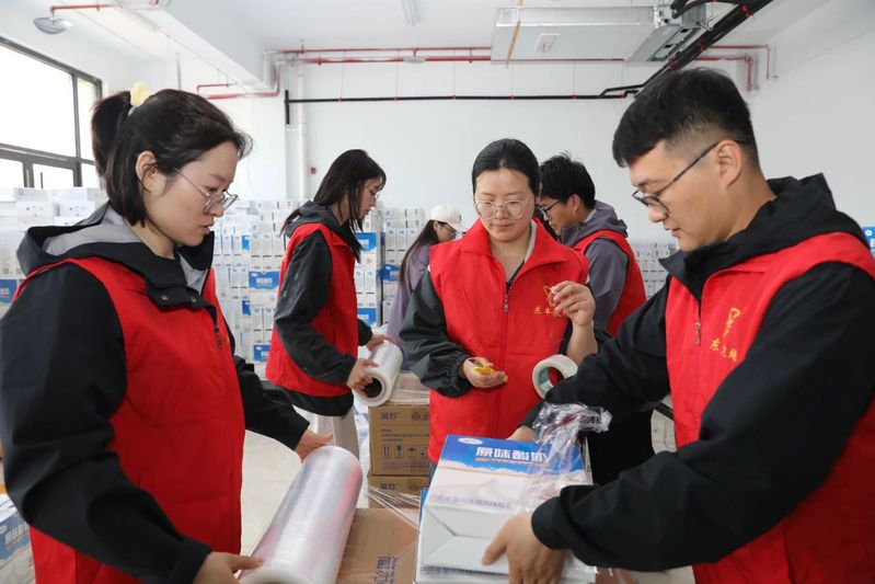 在打包现场,身穿红色马甲的志愿者们三人一组,与冷链物流公司员工并肩作战,有条不紊地完成封箱、贴标、搬运等工序,生产线上跃动的“志愿红”成为最亮丽的风景线。