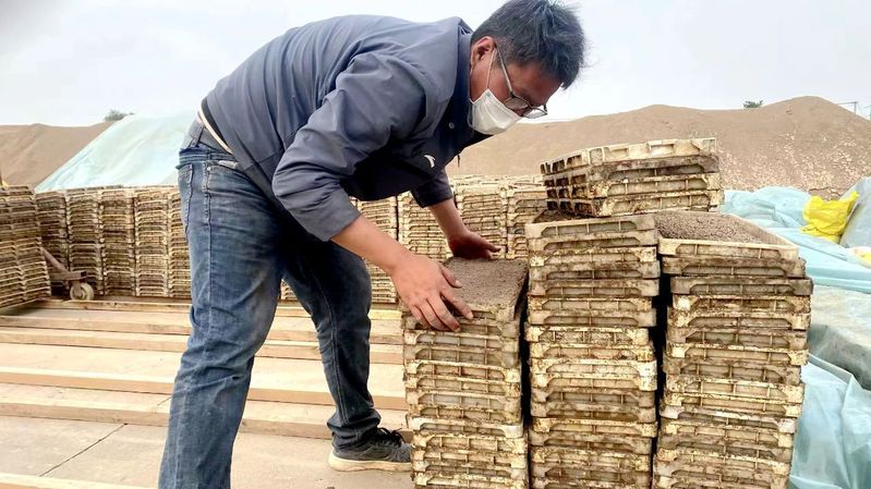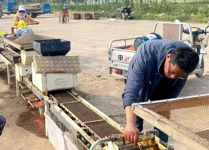 与此同时,在新沂生产区落谷作业现场,技术人员正对育秧流水线进行细致检查,确保设备运行稳定,并仔细查看稻种拌种质量:“每粒种子都要均匀裹覆药剂,否则可能影响成苗。”通过推广“大壮苗”育秧技术和有氧恒温浸种催芽技术,精准控制浸种时间和药剂配比,秧苗的抗逆性和成活率显著提升。