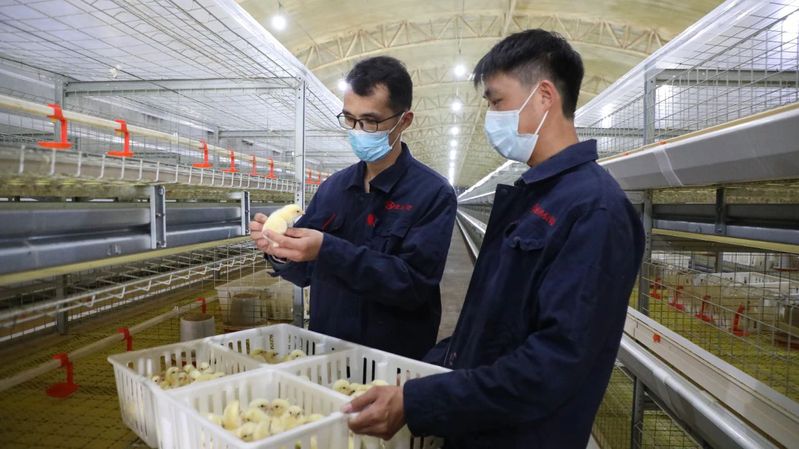 智能化升级赋能产业发展。东米公司率先引入自动化饲喂、智能环境控制系统,建成完备的粪污管网处理体系,生产质效大幅提升。走进现代化鸡舍,肉鸡在实时自动调控的舒适环境中,享用科学配比、精准投喂的饲料,鸡粪自动输送至舍外发酵罐,形成绿色循环发展体系。在东方鸡场改造现场,场长史明洋介绍:“四层笼养的单栋养殖量将跃升至4.7万羽,是原来的近三倍,产能将大幅跃升。”