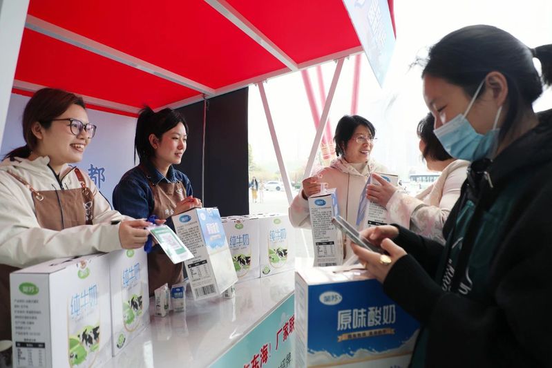 在“简苏”牛奶地推摊位前,免费试喝品尝的吆喝声吸引了大批顾客,大家品尝后纷纷给予高度评价并咨询购买。广东游客沈先生将随行包里未喝完的纯牛奶倒入一次性杯中,与“简苏”牛奶放在一起仔细比对,他先是观察牛奶的色泽,然后比较气味,最后依次品尝口感。品鉴后,沈先生竖起大拇指,操着一口地道的粤语称赞道:“‘简苏’牛奶香气扑鼻,入口丝滑香醇,唇齿间还留有淡淡的奶香味,真系食过返寻味,好正!”说罢,沈先生在工作人员的指引下,关注线上店铺并下单。