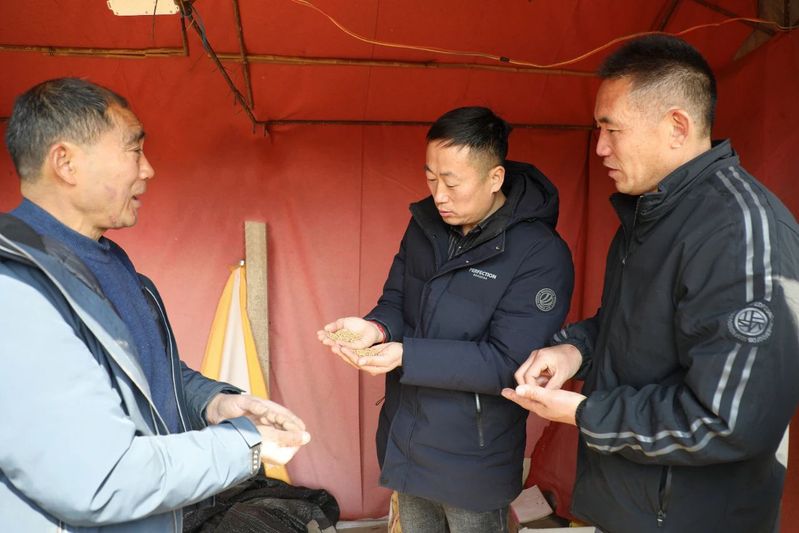 孙道鹏和沙鸥在与农户们交谈中了解到,蓝莓果树喜酸性土壤环境,且为了提升果实口感,农户们会将豆粕和发酵后的大豆拌入土壤,但由于把握不好基肥和微量元素等添加量,且蓝莓根系娇嫩脆弱,很容易伤根,影响果园产量和种植户收益。在听到农户诉求后,孙道鹏立即与沙鸥现场讨论配方改良,根据黑林镇土壤特性和蓝莓生长习性,决定在现有样品中适当添加菌剂和发酵过的颗粒大豆,使得改良后的蓝莓专用肥更加符合农户需求。在种植大户老徐的带领下,周边蓝莓种植户纷纷前来学习交流,并表示自愿划出一块区域用于后续有机肥改良试验推广。