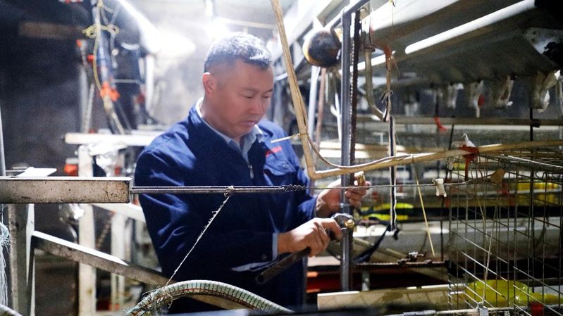 走进东辛东米鸡场,场长徐洪健正专注地对鸡舍高压喷雾加湿装置进行改装升级。