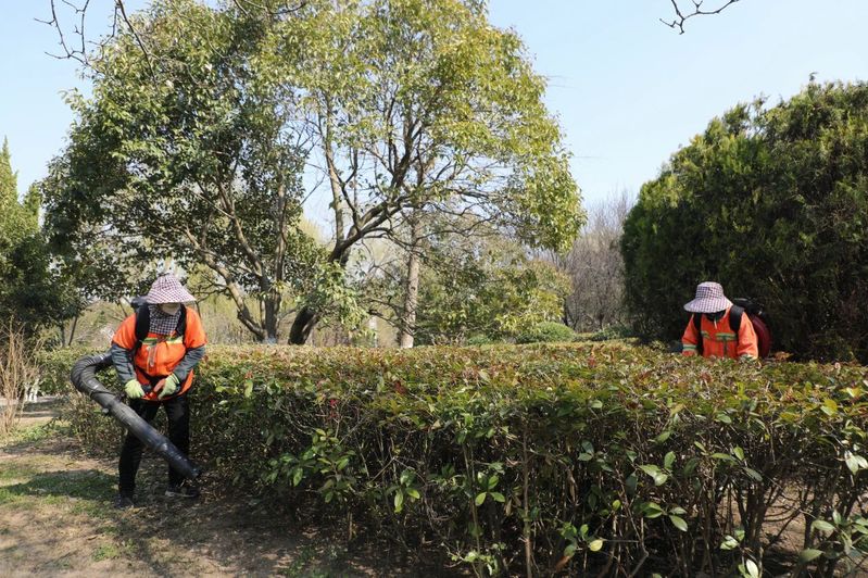 3月17日下午,走进东辛公园,远处传来机械轰鸣声,穿着橙色马甲的环卫人员正在有序清理落叶,她们手持吹叶机、钉耙、扫帚等工具,分组对公园内步行道、绿化草坪、休闲区等重点区域进行细致清扫。对于栈道长廊等地的小面积落叶,工人们用大扫帚将落叶扫聚成堆,收集至垃圾袋中进行清运。对于覆盖面积大、落叶较多的区域,环卫工人先使用便携式吹叶机将落叶吹聚在一起,再进行统一清扫、收集作业,确保清扫工作高效、彻底。路面保洁组组长王元栋说:“东辛公园占地总面积近百亩,植被覆盖率达85%,落叶周期长、落叶量大、清扫作业难度大等,环卫人员根据不同路段和区域的落叶情况,采取‘一扫二堆三收集’作业模式,尤其在落叶较多的路段,通过人机结合作业、延长作业时间、增加清扫频次等措施,保证清扫落叶的效率和质量。同时,采取科学有效的方式妥善处理落叶,清扫后的落叶被集中收集,运送到指定处理点进行分类处理,避免环境污染。”
