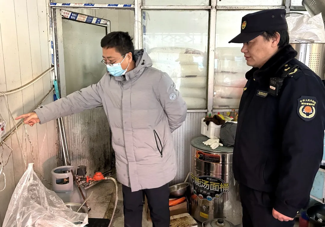 检查组深入商超、餐饮店等人员密集场所,重点对消防设施完好情况、用电用气规范及设施抗风雪稳固性进行了细致核查。在餐饮门店后厨,检查组发现燃气软管存在老化现象,当即对餐饮门店负责人提出提醒:“这根软管必须立即更换!雨雪天气燃气使用风险增高,请务必加强自查。”检查组还现场督促整改了私拉乱接电线等安全隐患。